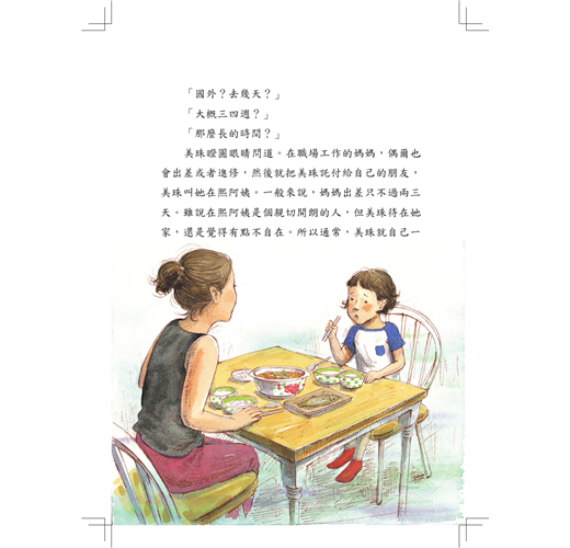 美珠瞪圓眼睛問道。在職場工作的媽媽,偶爾也會出差或者進修,然後就把美珠託付給自己的朋友,美珠叫她在熙阿姨。一般來說,媽媽出差只不過兩三天。雖說在熙阿姨是個親切開朗的人,但美珠待在她家,還是覺得有點不自在。所以通常,美珠就自己一個人在家。不過,這次媽媽要去三四週,比想象的長多了。