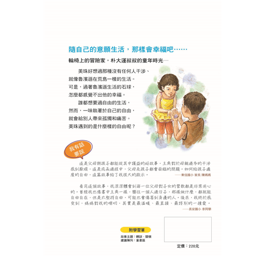 這是父母與孩子都能從其中獲益的好故事,主角對於母親過多的干涉感到厭煩,這是成長過程中,父母及孩子都會面臨的問題。如何給孩子適度的自由,這篇故事給了我很大的啟示。