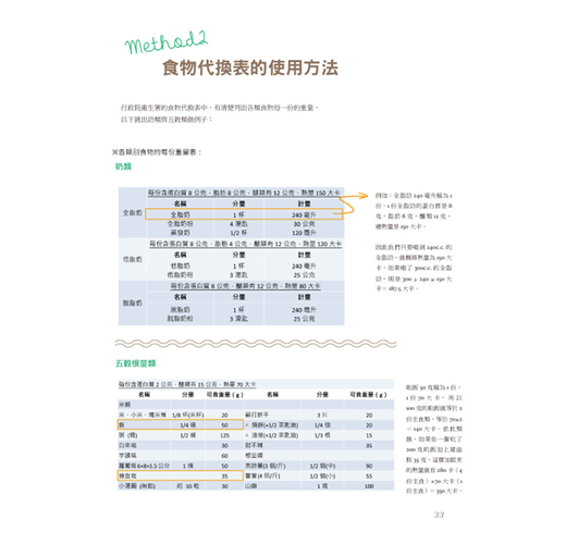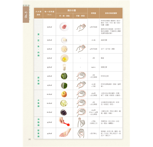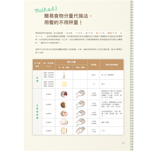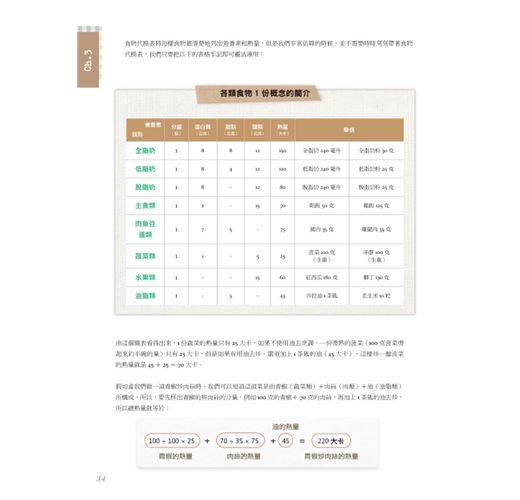 利用作者整理的簡易食物代換表,輕鬆記住1份食物的熱量。例如1份低脂奶240毫升=120大卡,1份主食=乾飯50克(1/4碗)=70大卡。