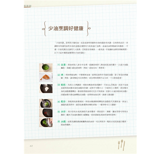 ★少油烹調好健康,利用6種簡單的少油烹調法,有效運用食物本身的油脂在導熱均勻的恆溫下加熱,並逼出食物裡過多的脂肪。