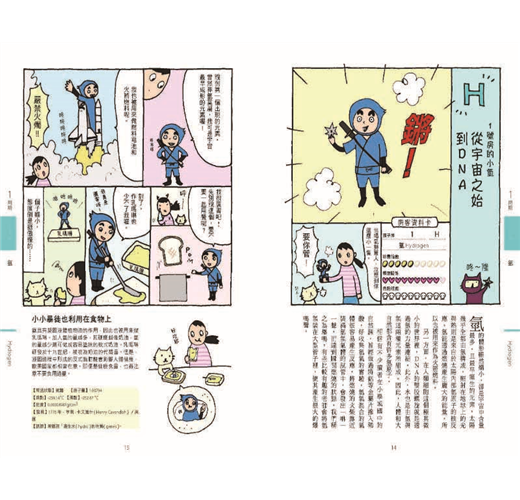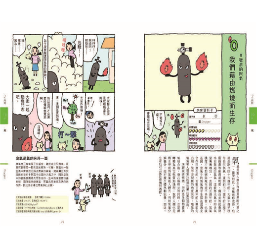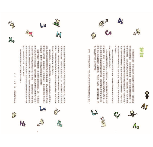 本書將元素週期表化作118個元素居住的原子公寓,而每個元素依照不同的特性,化身成可愛萌角,藉由漫畫演出自己的故事。所以我們會認識輕飄飄、氣球一般的氦,講起化來卻會怪聲怪氣;黑嘛嘛的碳,趁人不注意就可能會變成鑽石;差點就變成縱火狂的氧;推理小說裡的常客砷(常見化合物為砒霜),是個笑得令人發毛的老婆婆;還有把防繡油當防曬油塗的鐵道迷小鐵,碰到磁浮軌道就會做出危險動作去臥軌。