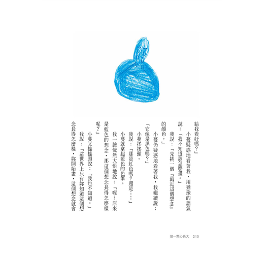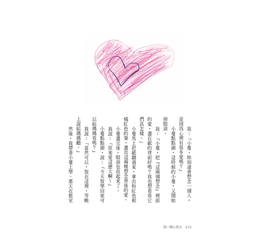 我離開電腦走到女兒跟前,蹲下,用手抹去她臉上的淚水,問說:「妳看到哪裡,所以哭哭了?」女兒指著紙稿上的圖畫說:「我看到我想媽媽……還有我畫的圖……還有我愛媽媽。」本來專注在講義世界裡頭腦快速運轉的我,瞬間被女兒的柔軟觸動。原來孩子是因為這些文字,又再次碰觸到愛。