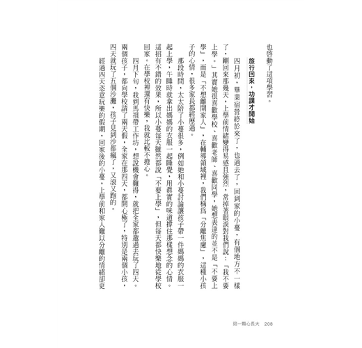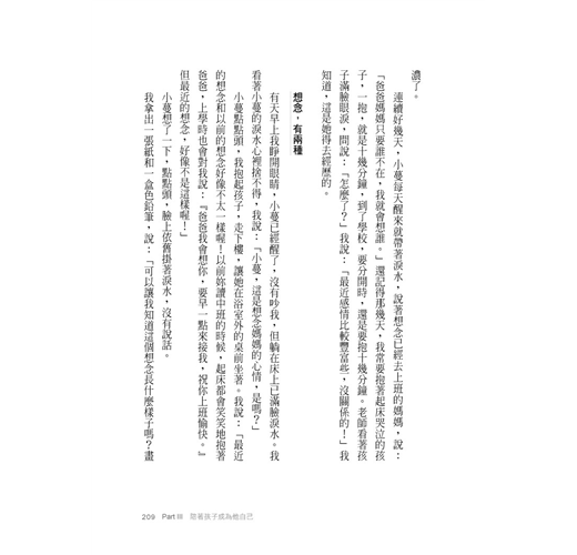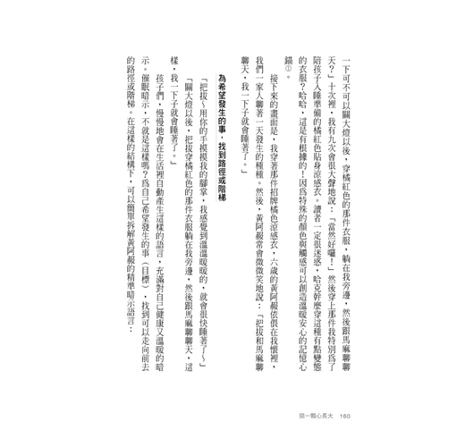 序末,再說兩件事情。一是在您翻開書頁前我要特別提醒:別把我和哈克當成「親職專家」了。這不是謙虛,我們只是和一般父母一樣,平凡且深愛孩子,所以我們在此書裡不會說著「完美父母」的故事。恰恰相反的是,我喜歡說我們如何受困、無助與生氣,卻又不放棄想辦法愛孩子的故事。我認為一個家有受困的難受和努力的美好,這個家的故事才是真實又好聽的。