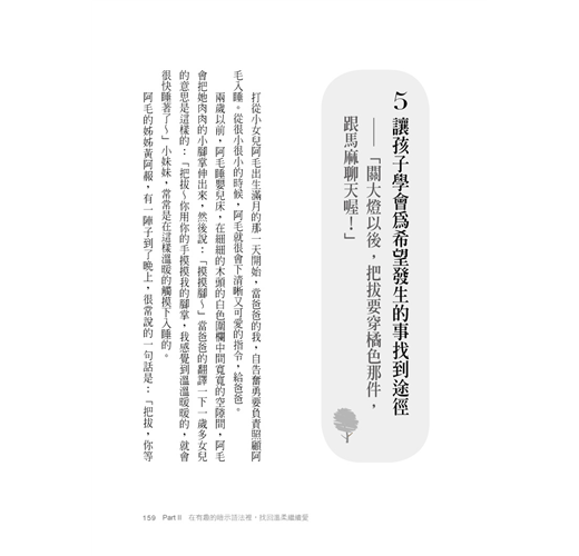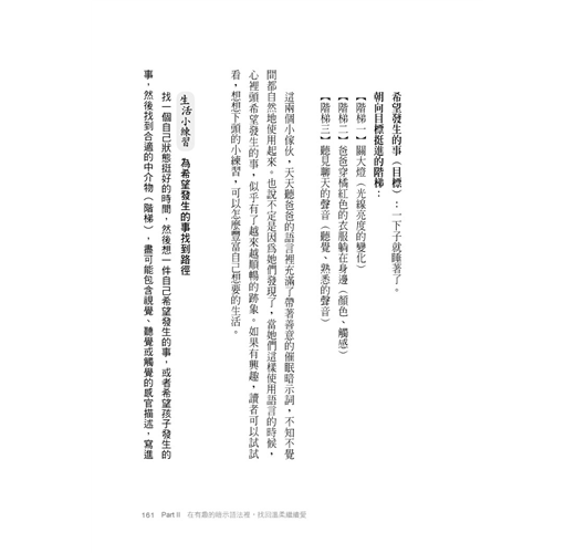 不過,哪家孩子不吵架、不哭鬧、不惹媽媽生氣?哪家小孩不用提醒一百遍就會自動刷牙、乖乖睡午覺、少吃薯條、看電視時的距離保持螢幕對角線的二‧五倍?但聰明絕頂如哈克,可不願讓自己有限的耐心和體力,白白地被生活與教養上的瑣瑣碎碎所耗損。他可是想把自己有限的能量,保留給他對孩子最單純的愛與歡樂的!所以,他用很多的策略與方法來引導孩子進入合作的狀態。這些方法,大多伴隨著語言、表情、語氣來完成,有的溫馨得讓人無法抗拒(像是溫柔的床邊故事),有的指令清楚到完全沒有打混摸魚的模糊空間(像是在孩子看電視越看越往前的時候,下達清楚的行為指導語),有的則是語言模模糊糊又好玩有趣,讓孩子還搞不清楚狀況時,內在的心情與狀態就被爸爸同步與帶領了(例如四歲的阿毛戒不掉吸手指,爸爸講的「毛毛小球飛到空中」的故事,或是問阿毛「妳的肚臍想上學嗎?」,來陪伴不想上學的阿毛)。