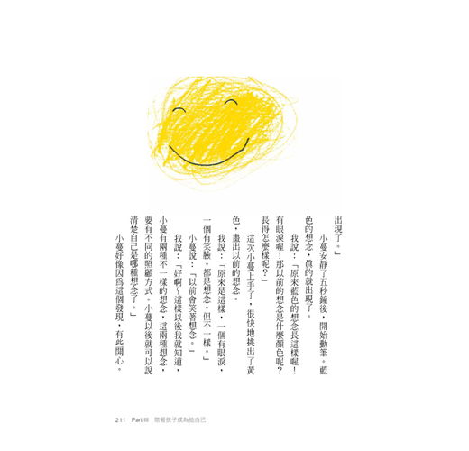 我覺得小孩有一種超能力,就是能不費吹灰之力地,把沉睡在父母心底的暴怒一下子給釋放出來,瞬間將父母變成噴火龍。更厲害的是,他們可以讓噴火龍於下一秒再變身為溫暖和藹愉快的水果奶奶。經歷了「不斷在噴火與和藹可親之間瞬間變身」,多年後,深切體認到,我們當父母的,唯有在自己心中的愛很流動、內在空間很安穩自在的時候,才禁得起小孩無盡的耍賴及要求,甚或吵鬧,而努力地不變身成噴火龍。而我看見這本書,很多地方都在說著,父母如何能不變成噴火龍,以及變成噴火龍後要怎麼變回來。