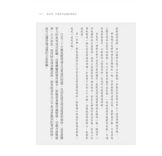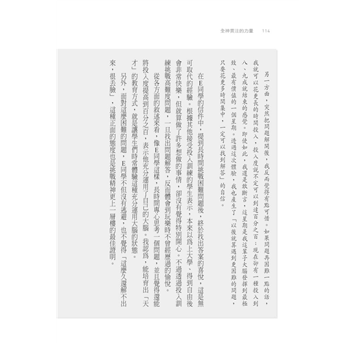 另一方面,突然把問題解開後,我反而覺得有點可惜。如果問題再困難一點的話,我就可以花更長的時間投入,投入度說不定可以到達百分之百;現在卻有一種投入到八、九成就結束的感覺。即使如此,我還是敢斷言,這星期是我這輩子大腦發揮到最極致、最有價值的一個星期。透過這次體驗,我也產生了「以後就算遇到更困難的問題,只要花更多時間集中,一定可以找到解答」的自信。