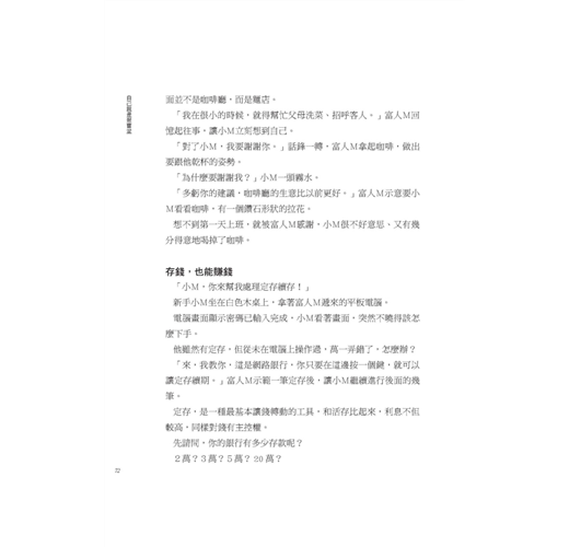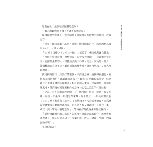 「對於錢比較少的人來說,如果沒有做出定存的動作,怎麼會有這些錢?」富人M問小M:「你還記得『收入、儲蓄、支出』的致富公式嗎?」