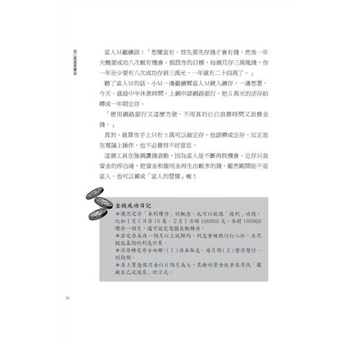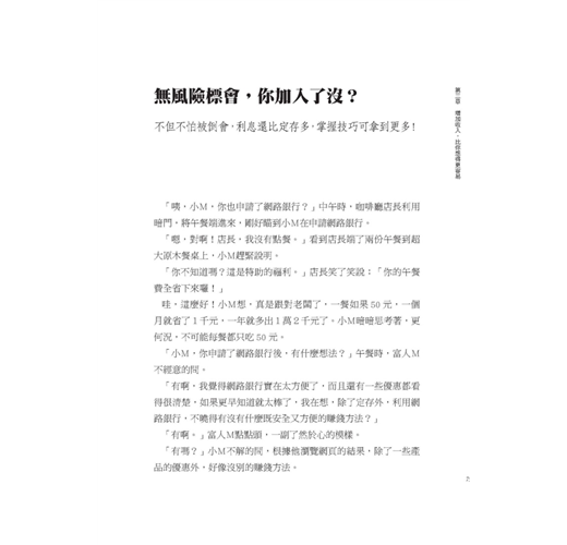 「可別小看這些錢,你想想看,只要按幾個鍵,一年就有近900元,也雖然金額不大,可都是多出來的錢,而且,因為是一個月,控制權就在自己手上,看到更好的機會時,隨時可解約。」富人M解釋著。