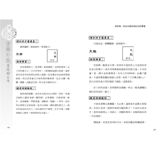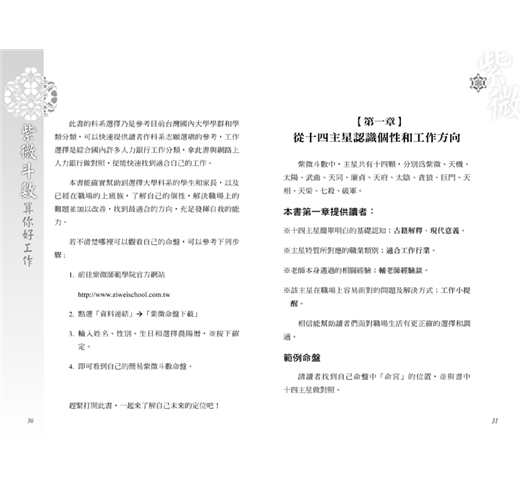 人不論有沒有信仰,都曾祈禱上天能夠幫助你成就功名、財富、健康等等,資訊告訴我們先天所屬的十二生肖及西洋星座似乎都決定了性格,在須要時求助卜卦或斗數指點,跟迷信是扯不上關係的,當你打開這本書,表示你對仕途決擇希望獲得指點,那麼你選擇正確,因為紫微斗數的推命技巧十分細膩,所運用之數理相當深奥,能得精髓者不易。輔老師針對選擇科系與職場,縮小範圍深入淺出、避開艱澀,闡述斗數的基本概念,明白點出所在命宮星性特質,使讀者易於得到所期待的答案;但是,最重要的還是要建立自信與努力不懈,必定會達到目標。
