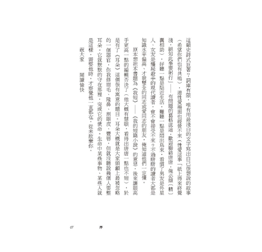 《耳朵:唐辛子短篇小說集》是繼《我愛肚臍眼》、《創世基》和《有基生活》後的最新作品,也是唐辛子第一部短篇小說創作集。本書收錄了十四個故事,從青澀少年到憊懶中年,從校園到職場,從父母到伴侶,對愛的憧憬逐漸在一次次的失落中褪成無奈。霸凌、背叛、追尋、受傷…….,但故事中人依然堅持──在健身房中維持體態,在保養品中留住青春,希冀這副美麗肉身,仍能作為下一段愛情關係的入場券。