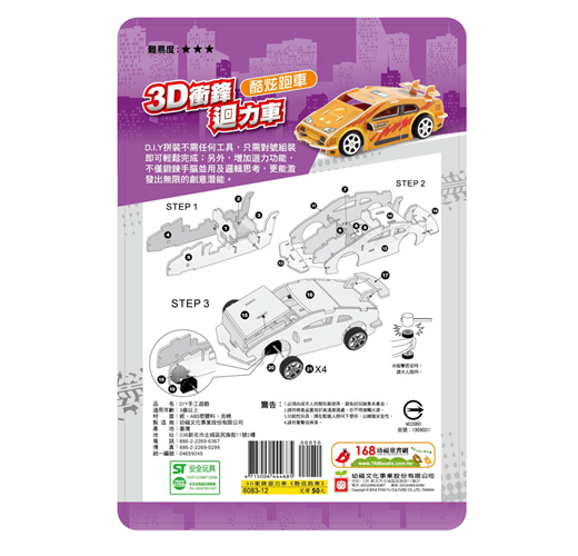 D.I.Y拼裝立體3D的過程中,不僅可鍛鍊手腦並用及邏輯思考,更能激發出他們的創意潛能。而內容配件以斬型方式切割,無需任何工具,只需對號組裝即可輕鬆完成;另外,還有增加迴力的功能,讓看似簡單的構造卻能為孩子帶來無窮的樂趣。