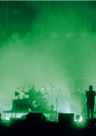 隨後回復到電音時段,屏幕閃紅光時,場內暖和如溫室,閃藍光則化成迷離幻境。Thom扭動著身軀,在狂亂的電子訊號中吟出催眠的咒語,〈Idioteque〉的電擊重拍咚咚咚灑落下來,觸發腳底的跳舞開關,台前跳得如痴如醉,舞到天旋地轉。