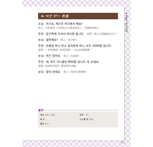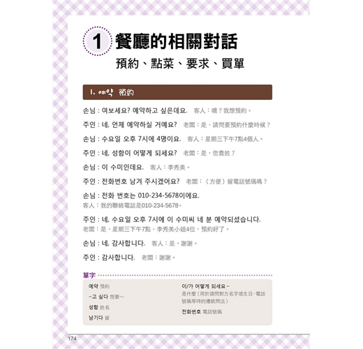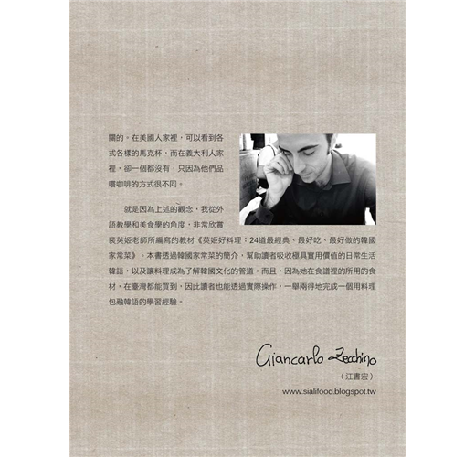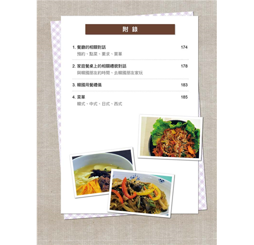 煩惱在韓國時不知該如何點餐嗎?還是與長輩、上司用餐時總是如坐針氈呢?別擔心!韓國媽媽裴英姬,除了料理一把罩之外,由於本身就是韓語教學名師,所以在本書的最後,特別附上精采的附錄,包含餐廳的對話、家庭餐桌上的對話、韓國用餐禮儀,以及韓式、中式、日式、西式菜單,讓您不僅吃到道地的韓國菜,學到扎實的韓文,還能體會最正確的韓國禮儀!
