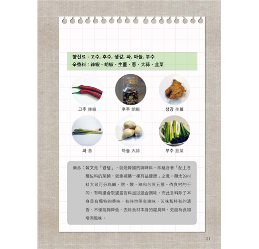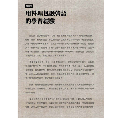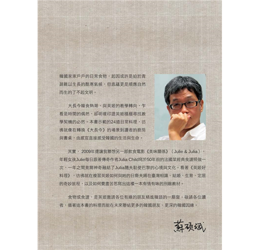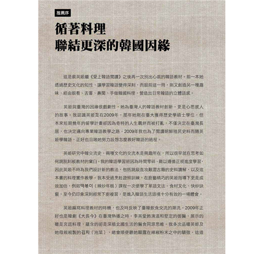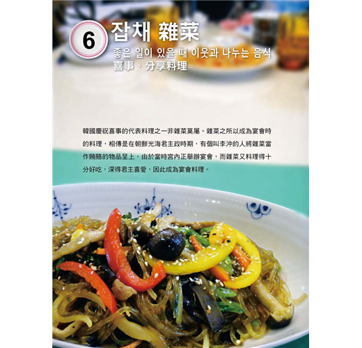 在韓國,大年初一要吃象徵多長一歲的「年糕湯」;有升遷等喜事時,要和親友鄰居分享象徵喜悅的「韓式煎豬肉丸」;還有生日時要喝感念母親生育之恩的「海帶湯」……。本書每一道料理,均詳細介紹背後的小故事,讓您一邊吃,一邊了解韓國文化,真是太有趣了!