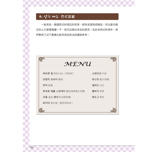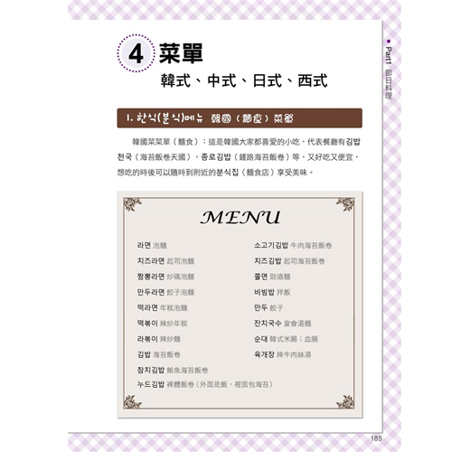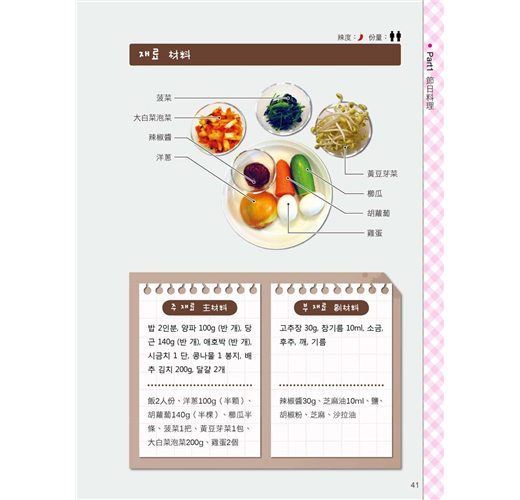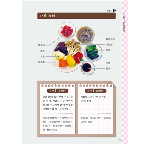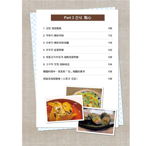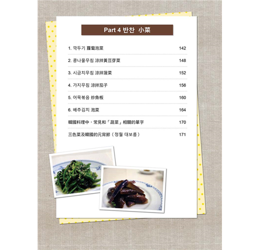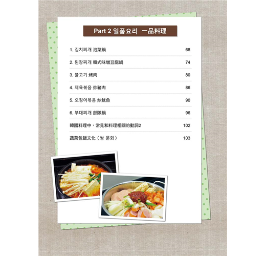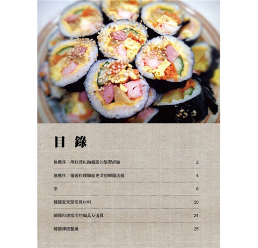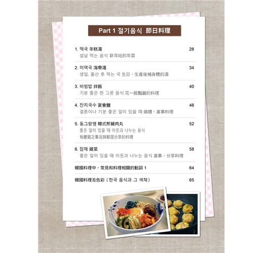 本書分4個單元,每單元有6道韓國家庭中常見的料理。了解韓國家庭準備節慶料理的緣由,不只能做出一手好菜,還能了解韓國歷史文化。