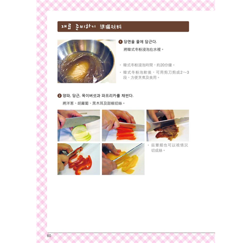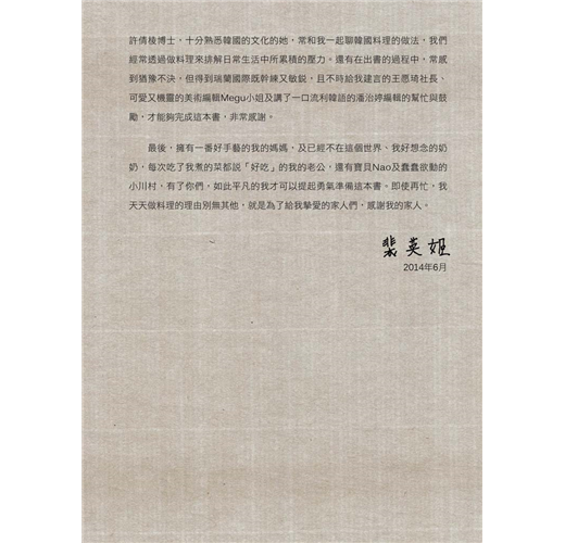 看了這麼多介紹,是不是想動手做做看了呢?不會做?很難嗎?不!做韓國料理一點都不難!超級簡單!本書步驟清楚、說明詳細、還有全彩連續相片可供參考,所以只要跟著韓國媽媽裴英姬,STEP BY STEP,就可以做出屬於您的韓國家常菜!