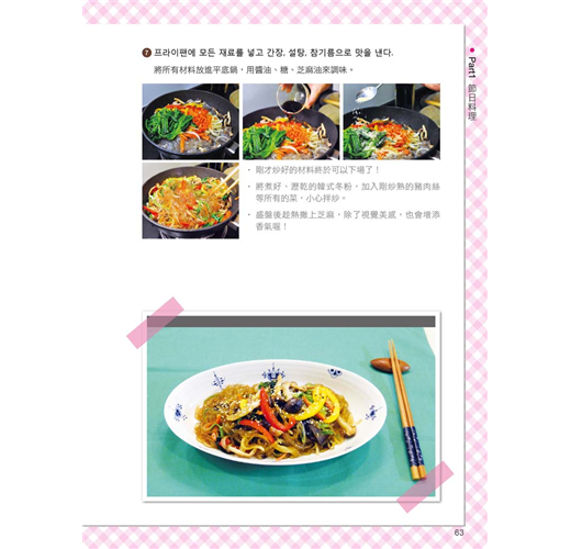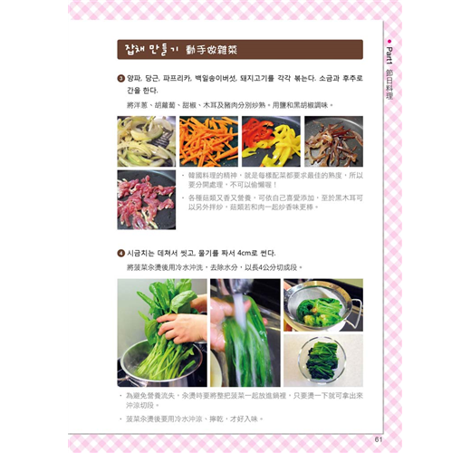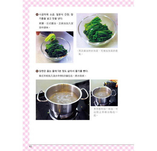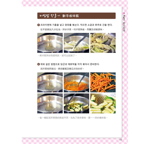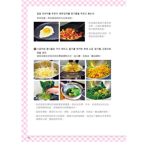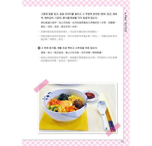 每一道料理,皆有中、韓文步驟對照,有如韓國料理老師貼身指導,帶您親手烹調最道地的韓國家常美味。