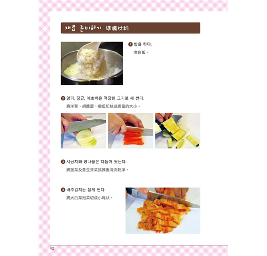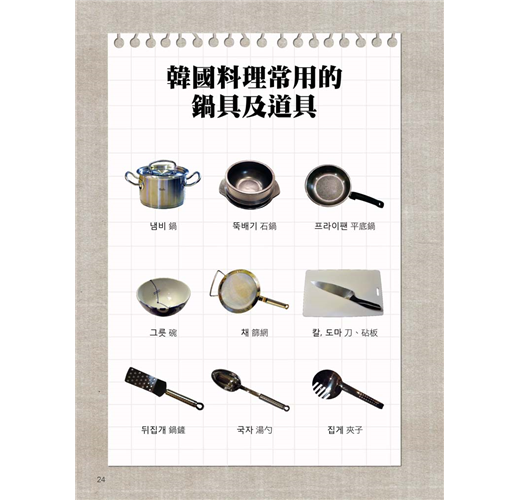 24道料理,皆由韓國媽媽裴英姬親自料理示範,從食材準備、分量拿捏到料理烹煮,一個步驟一個動作,還有貼心的料理小叮嚀,讓您輕鬆學會韓國料理!