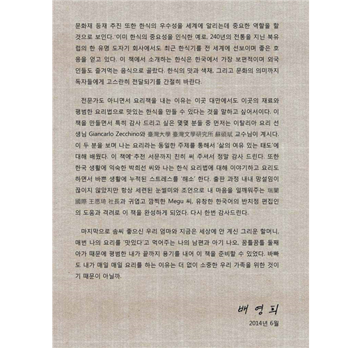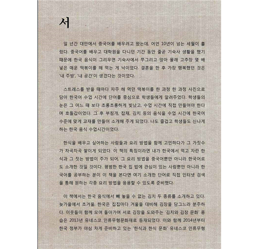 在臺灣10多年間,除了知道很多人想學習泡菜的作法,卻也發現大部分臺灣人知道的韓國料理只有泡菜而已,因此決定介紹更多韓國料理給臺灣人認識。不但在課堂上介紹給學生,也常請朋友或學生到家裡分享各種在臺灣吃不到的韓國料理。同時,也透過分享韓國料理,讓大家了解韓國飲食文化及風俗習慣。