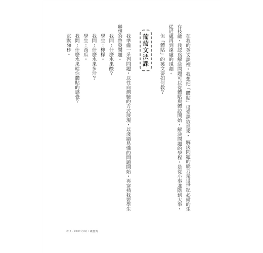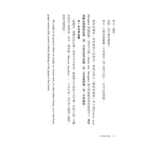葡萄文法課‧解決問題是一種體貼‧我在紐約教的第一堂英文課‧我是最好的,所以我得到這份工作‧提子與葡萄之間‧微妙的三角關係‧月光下媽媽的芒果樹‧可是有一天,Macintosh哭了……‧與香菇共存的白樺樹(silver birch)