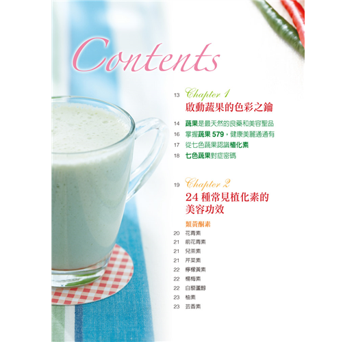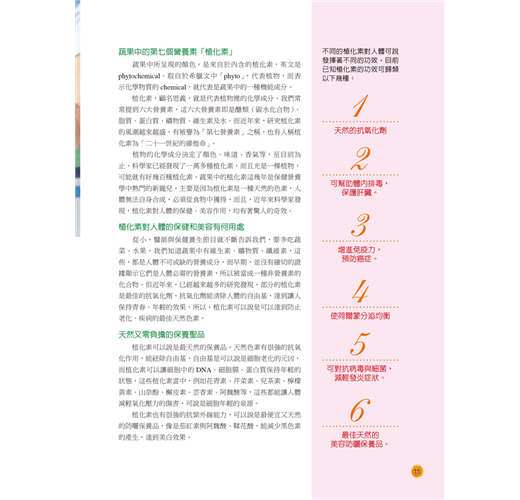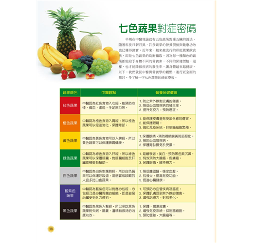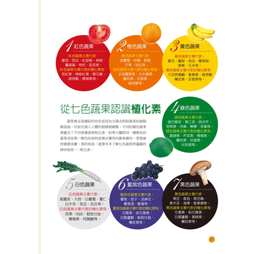 針對時下最夯的超強養生天然素─「植化素」進行詳細解說,並貼心羅列「七色蔬果」與「植化素」速查對照表,讓您輕鬆對照,一目了然!
