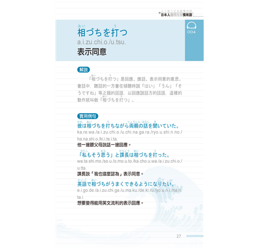 「相づちを打つ」是回應、應話、表示同意的意思。會話中,聽話的一方會在傾聽時說「はい」「うん」「そうですね」等之類的話語,以回應說話方的話語,這樣的動作就叫做「相づちを打つ」。
