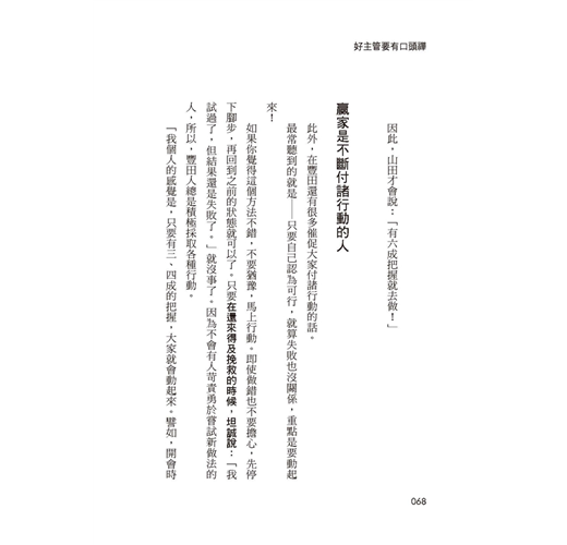 最特別的是,豐田是一家汽車製造廠,但是在閱讀的過程中,卻讓身處出版業的我也感到十分受用。像是「改善──巧遲不如拙速」這句話,說的就是與其精雕細琢而延遲(巧遲),或是縝密規畫而流於空想,倒不如「快快做」,就算一開始成果比較粗糙、拙劣,都還有時間去嘗試、改善。