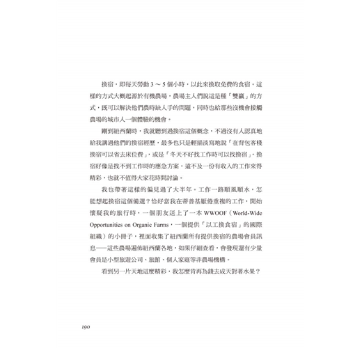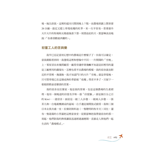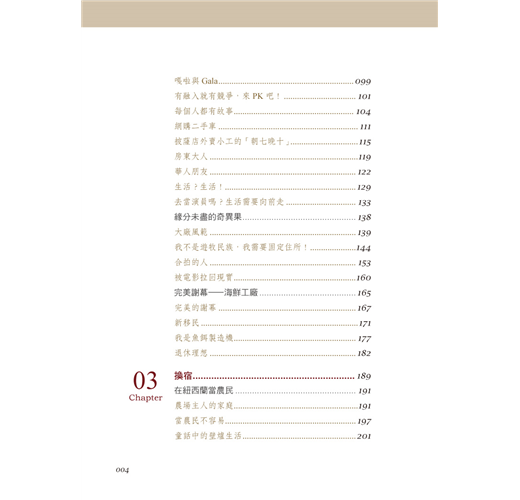 憑著一股衝勁,巴道毅然離開溫暖的家飛向紐西蘭,一路上從學習開戶、到賭場小試身手、誤打誤撞找到第一份工作、與蘋果、奇異果親密接觸,甚至是後來的農場換宿,都讓巴道體驗有別過去的人生,即使逛街時包包不幸被竊、不見護照的手足無措、到後來遇上車禍,都改變不了早已經愛上紐西蘭這個事實。
