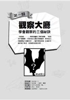 「別懷疑,這就是我要教你的另一個絕招。觀察第二招:積極運用五官一起『觀察』。比如,描寫一個小動物,可以用眼睛觀察外形,用耳朵聽它發出的聲音,用鼻子嗅一嗅味道。或是描寫一種水果、食物或一株植物,除了用眼睛、鼻子觀察外,還可以用嘴巴品嚐一下滋味。」