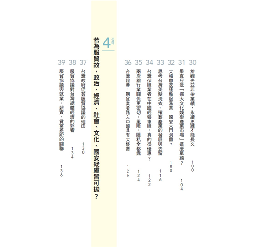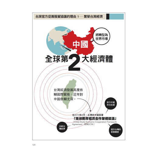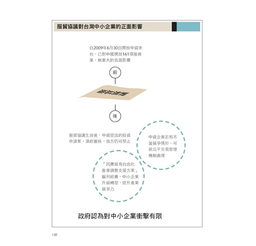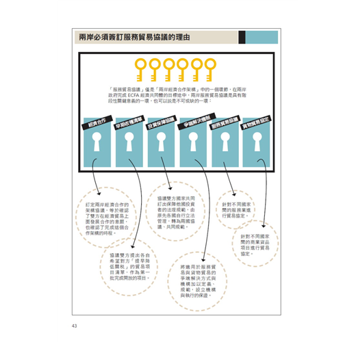 以深入淺出的文字搭配圖解,從服貿的起源全球化說起,再逐漸聚焦於台灣與中國近年的經貿整合過程,最後一一列出服貿協議對台灣產業、社會、文化、政治的影響,透過簡潔易懂的方式,讓讀者對服貿有一全盤的認識。