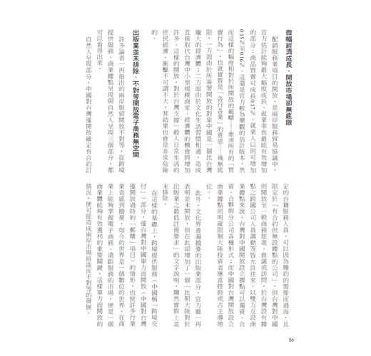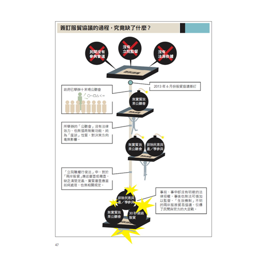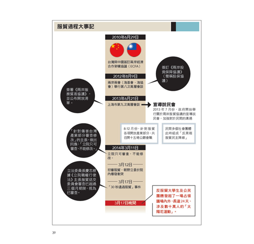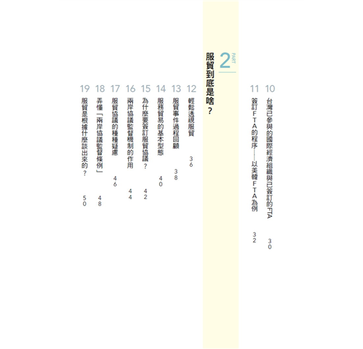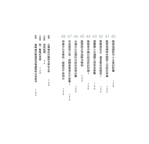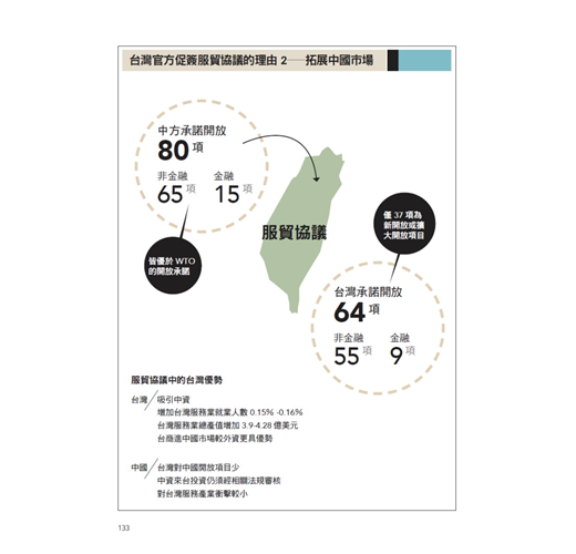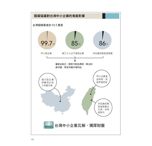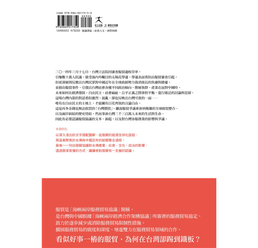 二○一四年三月十七日,台灣立法院因審查服貿過程草率,引爆數十萬人抗議、廣受海內外矚目的太陽花學運。學運表面看似由服貿審查引起,但更深層則反應出台灣民眾對中國近年在全球政經勢力我消彼長的焦慮與擔憂,並經由服貿事件,引發出台灣社會各種不同政治立場、階層族群、產業在面對中國時,未來如何在經濟發展、自由民主、社會福祉、公平正義之間拿捏平衡,進行廣泛的討論與思辯。這場台灣內部的對話看似激烈、混亂,卻也反映出台灣可貴的一面──唯有在自由民主的土地上,才能擁有百花齊放的言論自由,這是再多金錢也無法收買的「台灣價值」。雖說服貿爭議牽涉到複雜的全球經貿整合,以及兩岸糾結的歷史情結,然而事涉台灣二千三百萬人未來的生活與生命,因此有必要認識服貿協議的文本、源起,以及對台灣各服務業的影響與爭議。