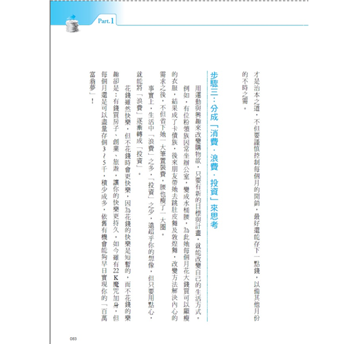 最後,本書特別整理夫妻理財的眉角。通常夫妻的消費性格都不太一樣,而「夫妻理財」想要發揮一加一大於二的綜效,必須兩人有共同目標,加上具體的方法、有紀律的執行,並定期檢視每一階段的達成度,再彈性調整理財步調,才能一步步累積家庭財富。