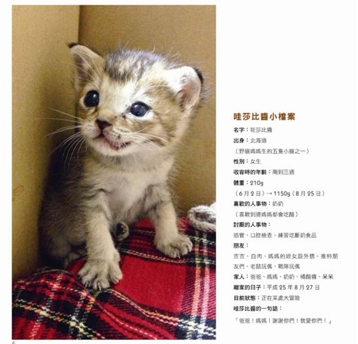 2013年,在路上被烏鴉攻擊時獲救的小貓,當時只有兩、三個星期大。「爸爸和媽媽」救回哇莎比醬之後,收為自己的家人。「媽媽」幫哇莎比醬開的推特帳號大受歡迎。經過細心照料,哇莎比醬的傷勢順利痊癒,但於七月三十日疑似癲癇發作,雖然治療之後不再發作,還是不幸於八月二十七日,悄悄走過了天上的彩虹橋,成為了天使。