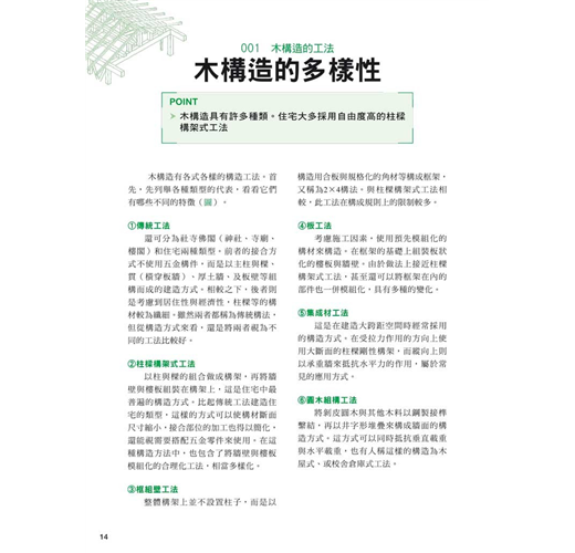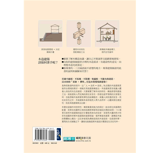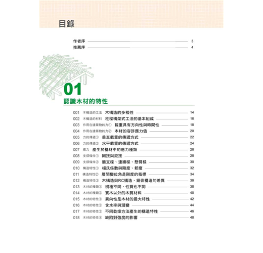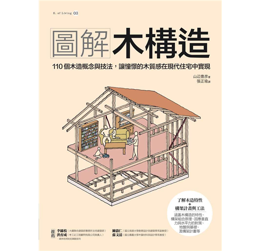 綜合上述各點可知,木建築的構架必須對木頭的特性、結合部的搭接方式與工法、壁體與屋頂的設計與配置、地質對地盤與基礎的影響有充分的了解,才能充分將木構造的「力˙美」高度展現。而本書的架構正是將帶領讀者透過對木材的特性、構架載重與施力的探討、結合部位的工法、地基與基礎的配置、到對抗災害的對策來認識木造建築。經過110個木造計畫的導引,以及詳細圖解來拆解木造工法,建構出整體核心概念,讓讀者對木造建築完全改觀,重新認識這項歷史悠久的傳統技術與工法。另外,也能將構架計畫確實地實踐在現代建築物中,落實永續環保的理念。