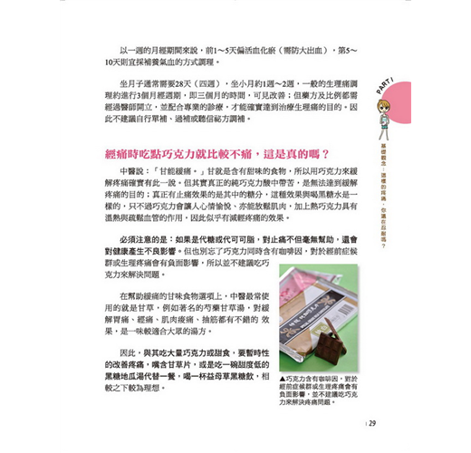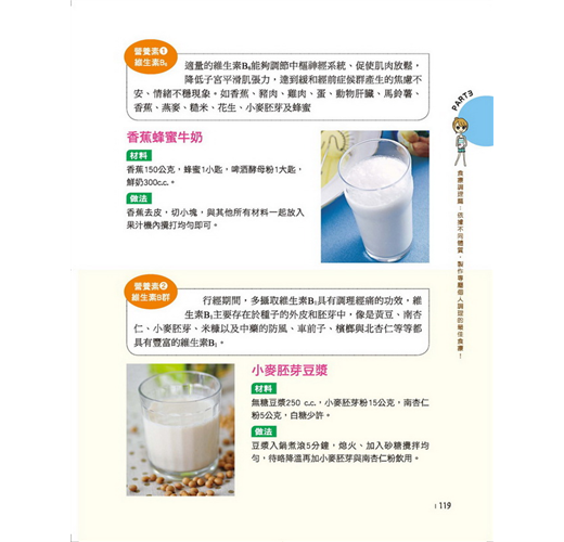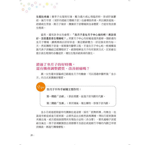 根據經痛的5大類型─「絞痛痙攣型」、「刺痛血瘀型」、「冷痛虛寒型」、「悶痛氣鬱型」、「痠痛腎虛型」,量身打造23種經典飲食配方,做法、適用對象、用途、飲用時機等都有詳細說明。