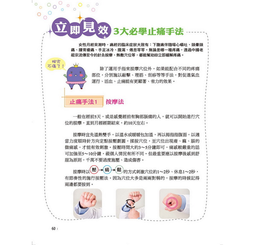 不管你是肚子痛、頭痛、腰痠背痛、胸部腫脹等各種惱人的生理痛,只要跟著書中詳細圖解及說明按穴位,並結合敲擊、刮痧等手法,短短10秒,有效緩解你的生理痛。每個步驟都一清二楚,跟著做就能輕鬆掌握技巧。