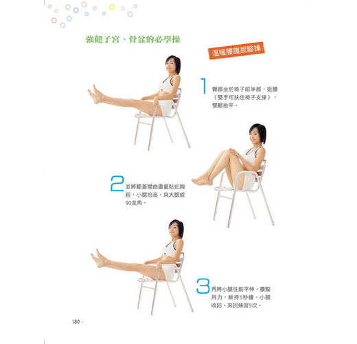 Point3 強化血液循環的伸展運動:溫暖腰腹屈腳操、矯正骨盆扭轉操、腹式呼吸法等。