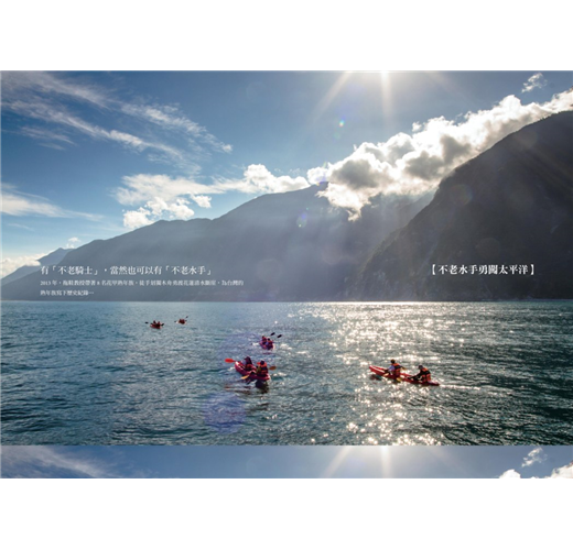 如果熟年族可以飆機車環台走透透,當然也可以划獨木舟成為不老水手!2013年夏天,拖鞋教授又突發奇想,號召了十位熟年族,組成「不老水手勇闖清水斷崖獨木舟之旅」,趕在颱風到達東海岸前,這群不老水手自清水斷崖下海划行獨木舟來回。這又是一個創舉!