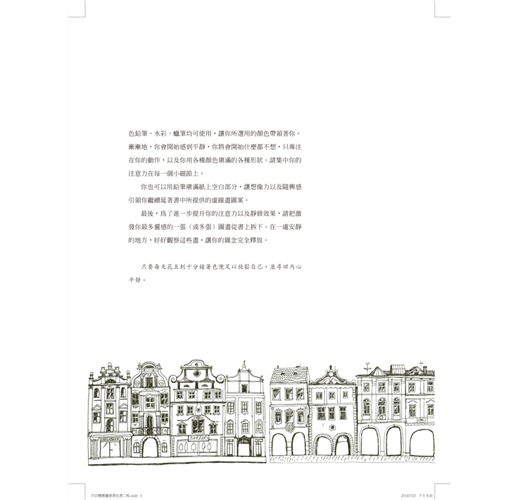 在為一幅幅漂亮圖案著色的同時,你也和童年時最單純的喜悅重新緊密連結在一起。別忘記從著色過程當中所散發出來的平靜及喜悅的感覺。你從來沒有在講電話的同時,還一面在筆記本上塗鴉,或是在雜誌上頭著色嗎?你喜歡這樣做,而且著色並不需要任何特別的才能。著色讓你得以和自己曾經有過的童年再度連結,並且喚醒沉睡在我們每個人體內的創造力。