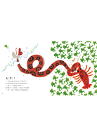 青蛙們排排站,同樣住在水中的大小螯蝦終於出場啦!身為一個畫家,我早就期待這個紅色身影的到來。因為在一群青蛙中,美國螯蝦的鮮豔紅色就像是萬綠叢中一點紅。不過最重要的是,那隻仰慕小蝌蚪的小螯蝦寶寶,他的存在是這個故事的關鍵。顏色和大小的對比,非常值得一看。