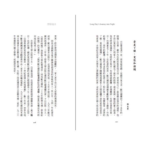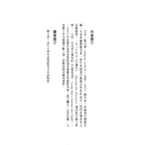 尤金.歐尼爾(Eugene O'Neill,1888—1953)劇作家,美國現代戲劇先驅,引進希臘戲劇元素,提升美國現代戲劇在世界的地位。他四度獲得普立茲戲劇獎,一九三六年以《天邊外》(Beyond the Horizon)獲得諾貝爾文學獎。一九四一年完成自傳性的《日暮途遠》(Long Day's Journey into Night)。一九五六年此劇在瑞典首都斯德哥爾摩皇家劇院首演,萬方矚目,佳評如潮。之後數十年各劇團不斷上演,更數度被改編成電影。