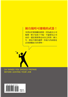 提升工作技能、找好人脈、不懂要盡量發問、養成愈挫愈勇的習慣、學習金錢的流向、在公司留下實績、趁辭職前多募集粉絲…。