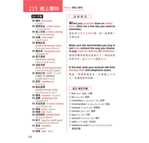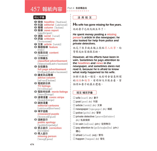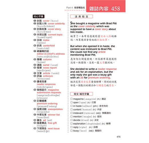 每一主題,都有一篇利用「核心字彙」所完成的「活用短文」,透過短文可了解字彙用法,同步提昇英語閱讀&寫作能力。