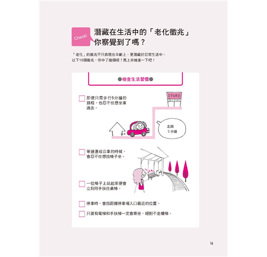 先依照第16至17頁內的項目對自己做個檢測吧!這兩頁所列舉的檢測項目,其實就是一般人最常發生的典型「老化」範例。
