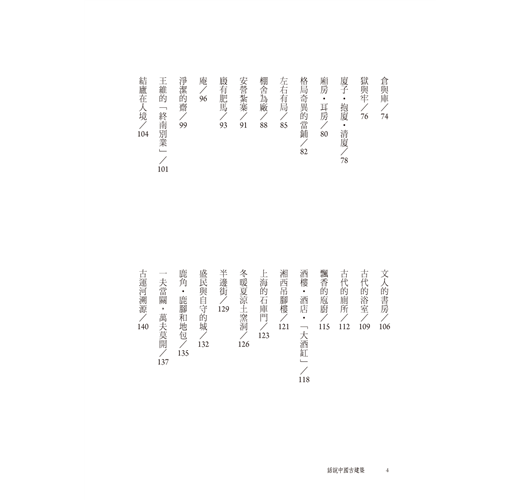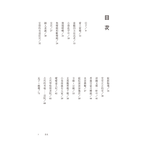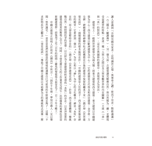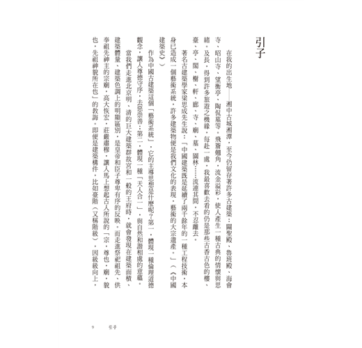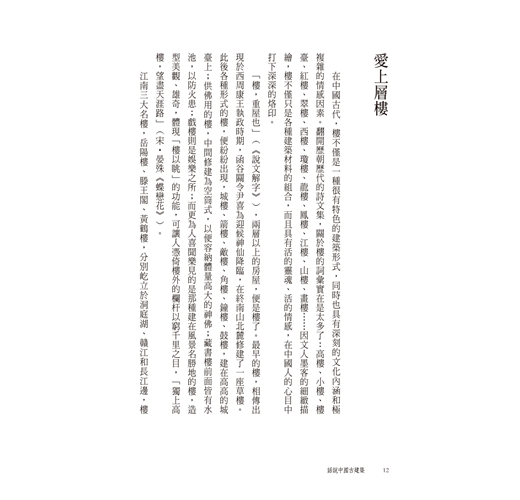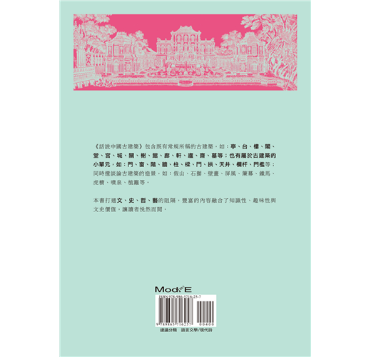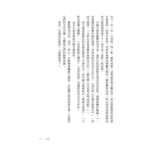 中國的建築有兩種特色:第一,體現一種倫理道德觀念,讓人尊德守序,去惡崇善;第二,體現一種「天人合一」,與自然和諧相處的意蘊。作者聶鑫森旁徵博引,談論中國古建築的種種特色,融合知識與趣味,帶領讀者如何觀賞中國建築物之美與其典故。