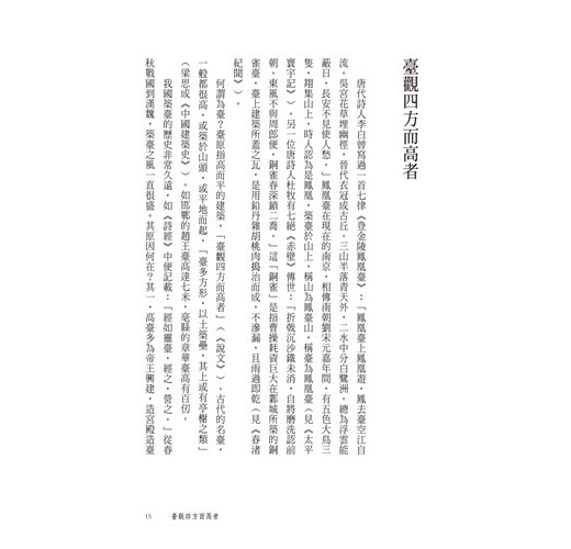 隨著歲月更替,臺這種建築的功能開始有所延伸。道家崇尚仙道,築臺只為求仙,陝西周至樓觀臺,老子在此講授五千言的《道德經》;漢武帝通道,在長安建通天臺,因高臺接天,似乎離神仙很近。而音樂家築臺,只為聲可傳播廣遠,如戰國時的大音樂家師曠在開封造繁臺(原名吹臺,繁姓住其側,故改名為繁臺)。還有漢中的拜將臺,是韓信受封大將軍之處;吳中的讀書臺,是呂蒙研讀典籍之所;桐廬的釣魚臺,東漢時的隱士嚴光在此築臺釣魚,怡然自樂。近代所建紫金山天文臺,則為觀天象所用。