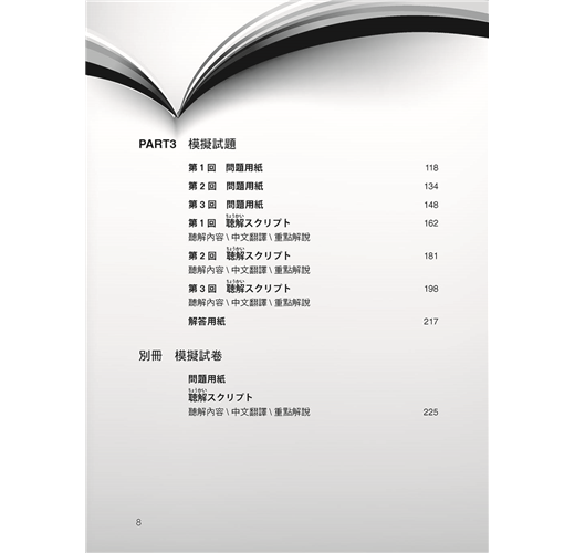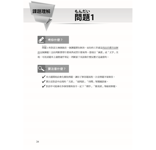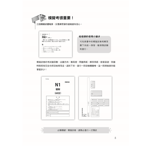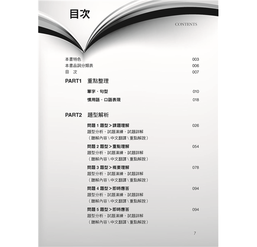 本次全新改版內容從「考試題目數、範例題、出題方向、難易度、版型格式、問題用紙、解答用紙、錄音語速、答題時間長短」皆重新改版撰寫,讓你在正式上場考試前,即以實戰測驗的方式學習的聽解書!