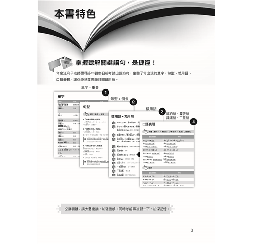 考前10分鐘重點總整理:「高頻單字、句型」、「必備慣用語、口語表現」一次彙整,考前高效複習,增加印象,聽解測驗輕鬆掌握!