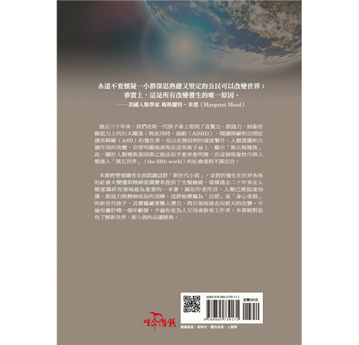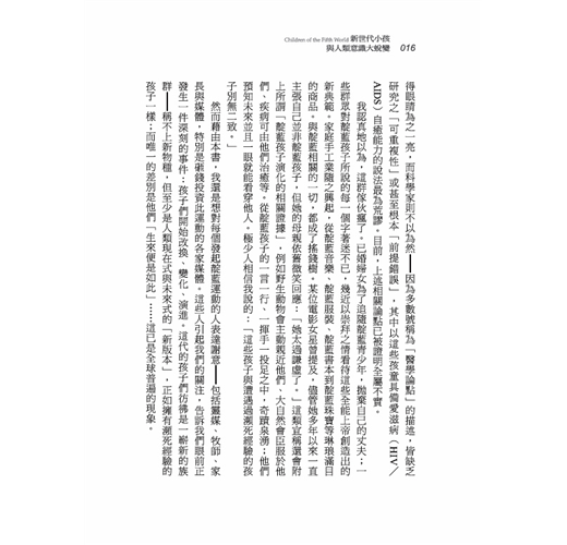 ※有別於一般親子教養書籍,在書中,作者先解釋了為什麼一九八二年之後出生的新世代孩子當中,大量出現注意力不集中、過動、閱讀障礙、自閉等現象之原因,以及此現象與人類進化的第五根種族又存在著何種關聯。
