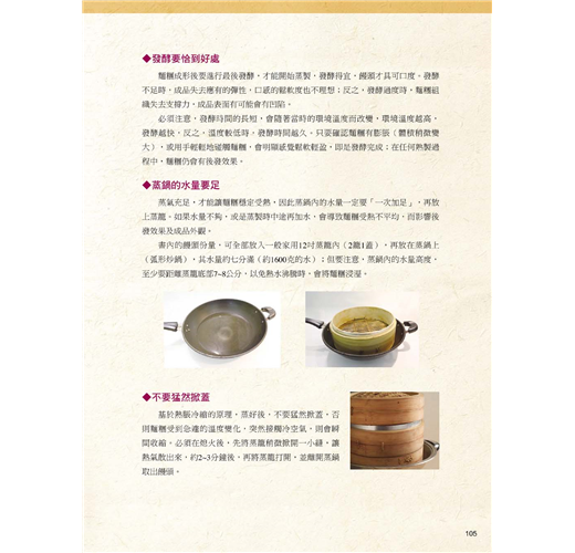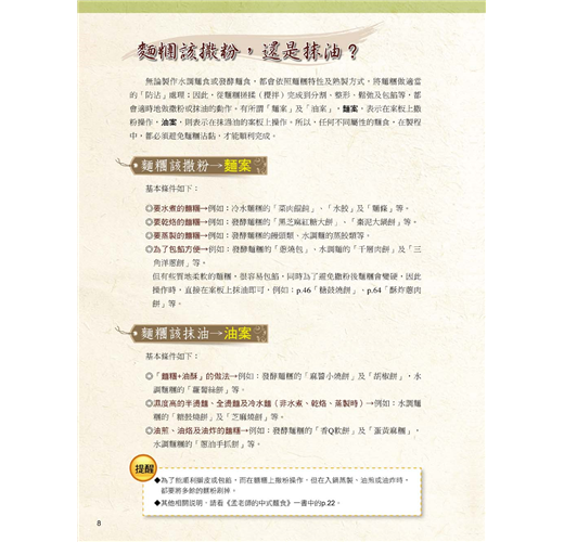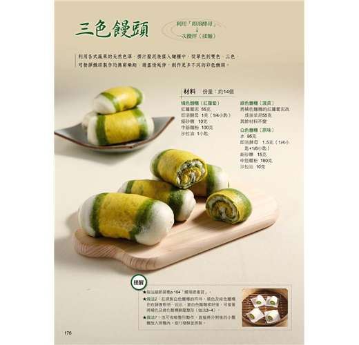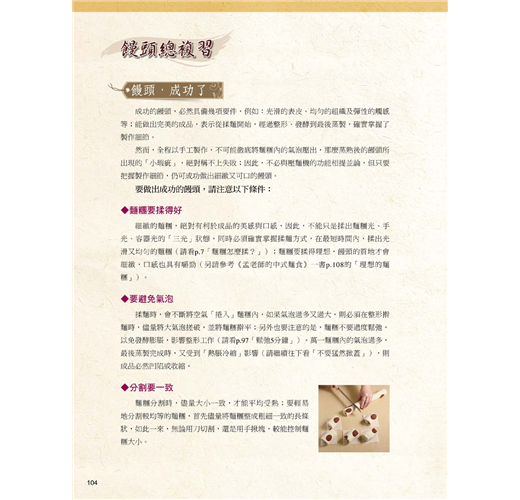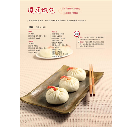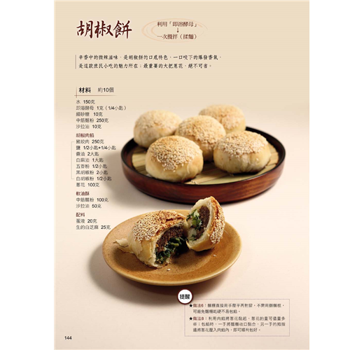 此外根據過去教學經驗,並綜觀大家在製作上的盲點或疏忽之處,也在本書中加強說明,其中的「饅頭總複習」及「包子總複習」等製作要點,希望對讀者們確實提點。請相信,製作中式麵食的門檻並不高,只要建立正確的製作「觀念」,並確實掌握製作原則,想要做出完美的成品,易如反掌呀!